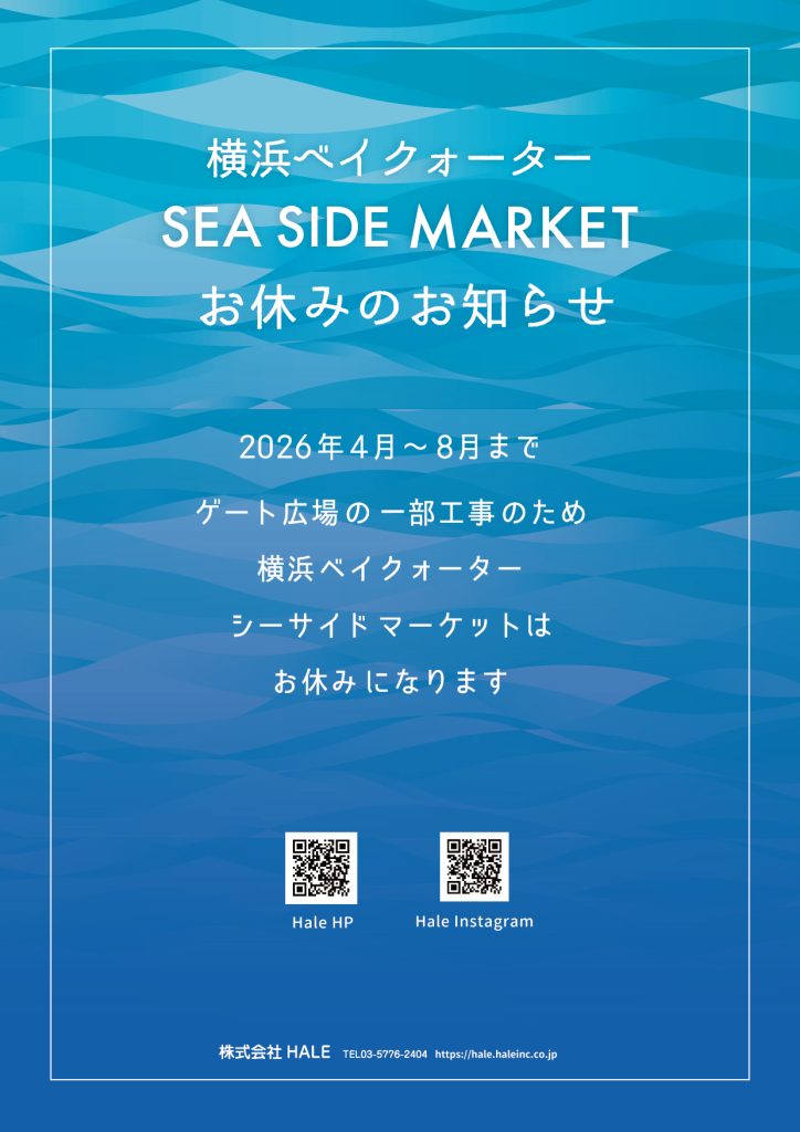 毎月開催しております、横浜ベイクォーター シーサイドマーケットにつきましては、開催場所となる3Fゲート広場の一部工事を行うため、シーサイドマーケットの開催は下記日程でお休みとなります。
